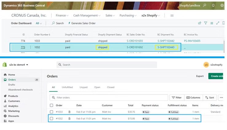 Once shipped, the status will be changed simultaneously on both platforms because the option of “Auto Upload Fulfillment” is enabled as mentioned earlier in this blog. Also, the shipment is created in Business Central.